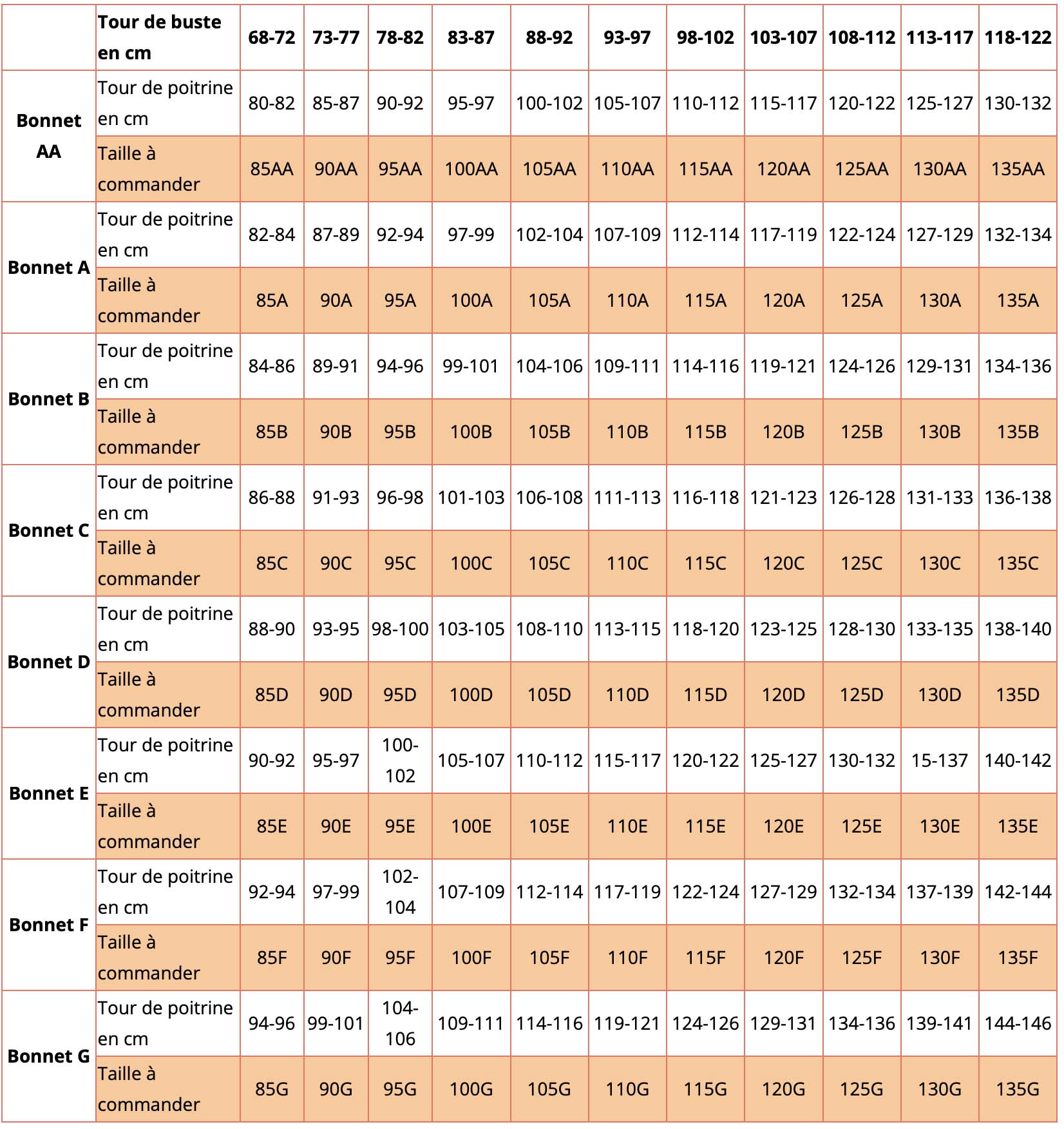Dans tous les cas, le mètre doit être bien tendu et ne doit pas pendre d’un côté ou de l’autre. Si votre tour de buste (sous le sein) mesure 80 cm (il se situe entre 78 et 82 cm) votre taille sera 95 et ainsi de suite Une fois votre taille du tour de buste trouvée, vous allez chercher la taille ou la profondeur du bonnet. Si votre ½ tour de poitrine est de 48,5 cm, on multiplie 48,5 x 2 = 97 cm le bonnet est D La taille est 95 D ![]() TAILLE DE LA PROTHESE MAMMAIRE![]() |