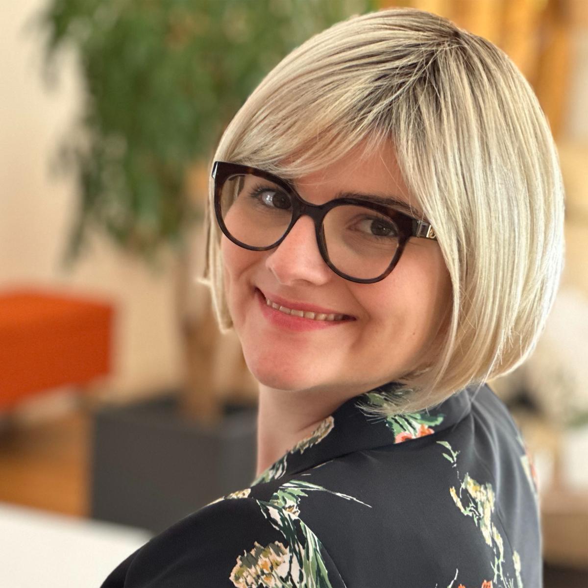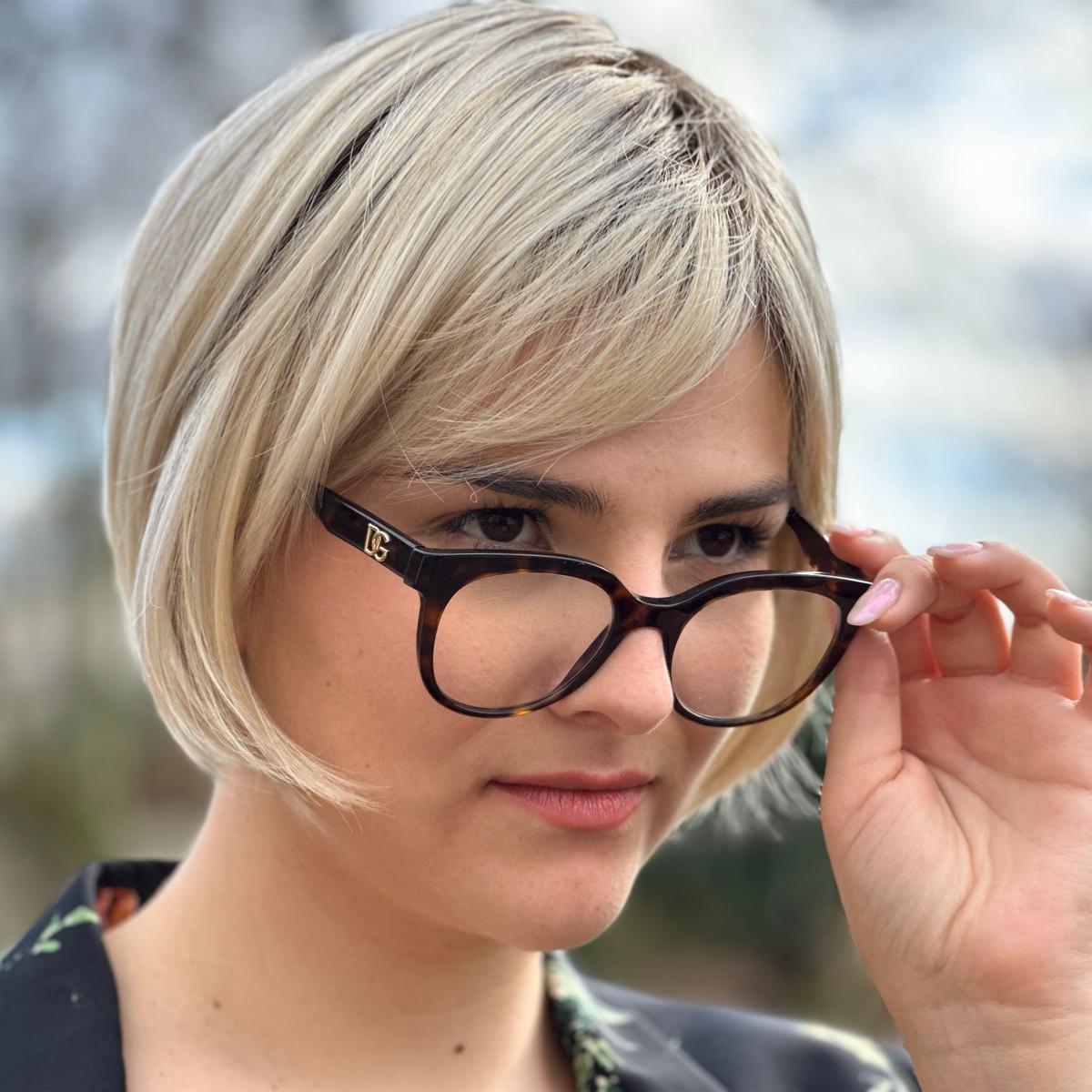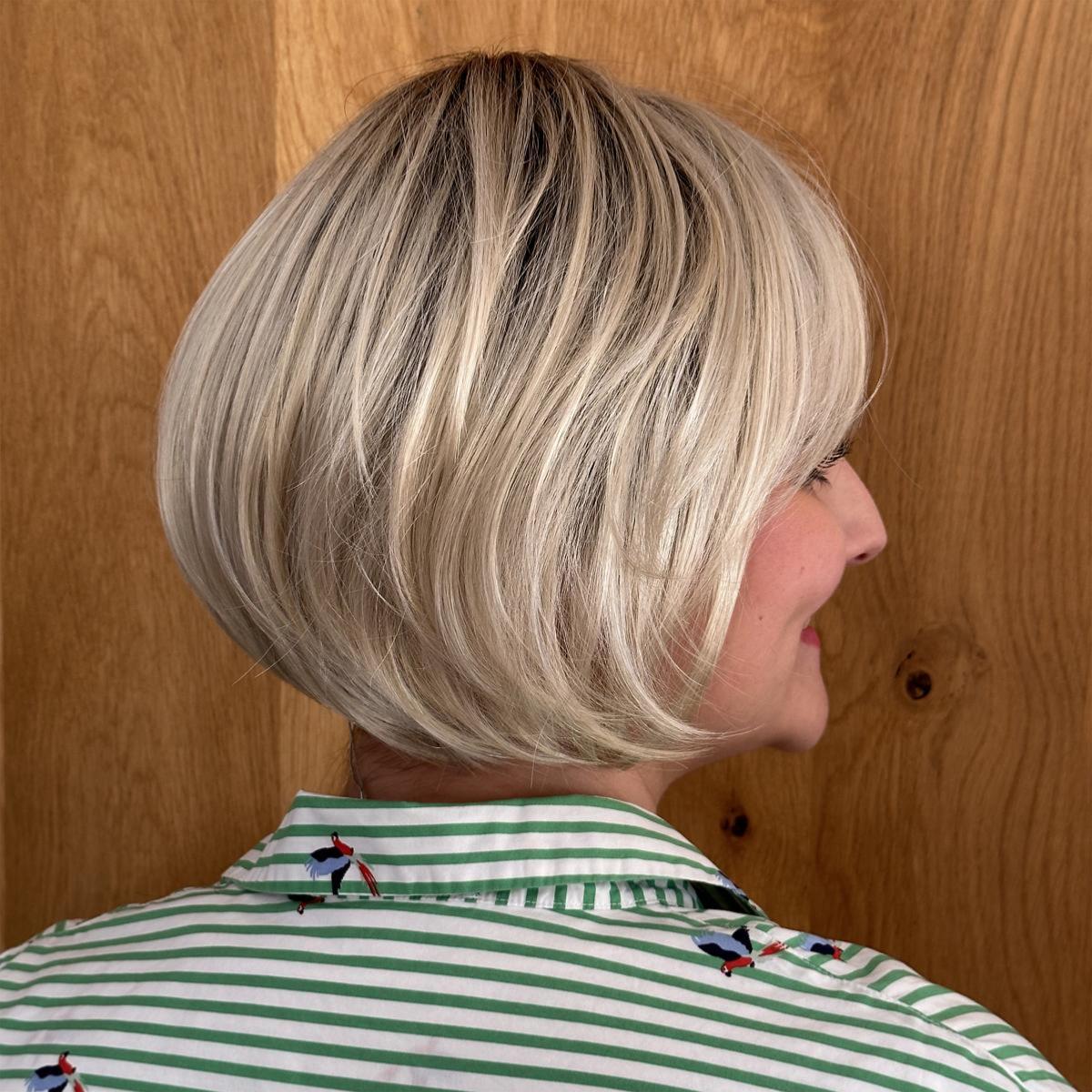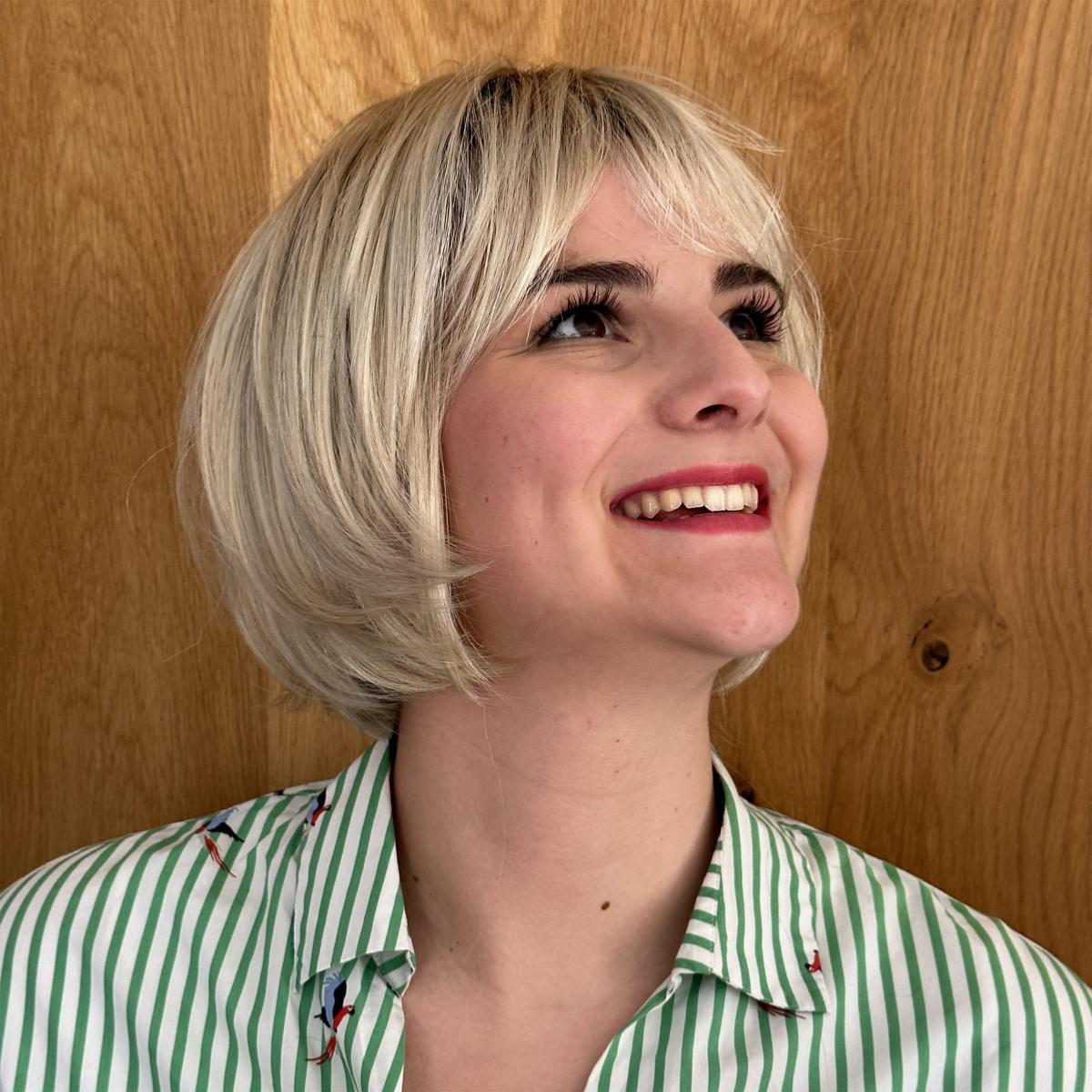 Les cheveux sont mi-longs C’est un carré court à effet plongeant avec une frange effilée.