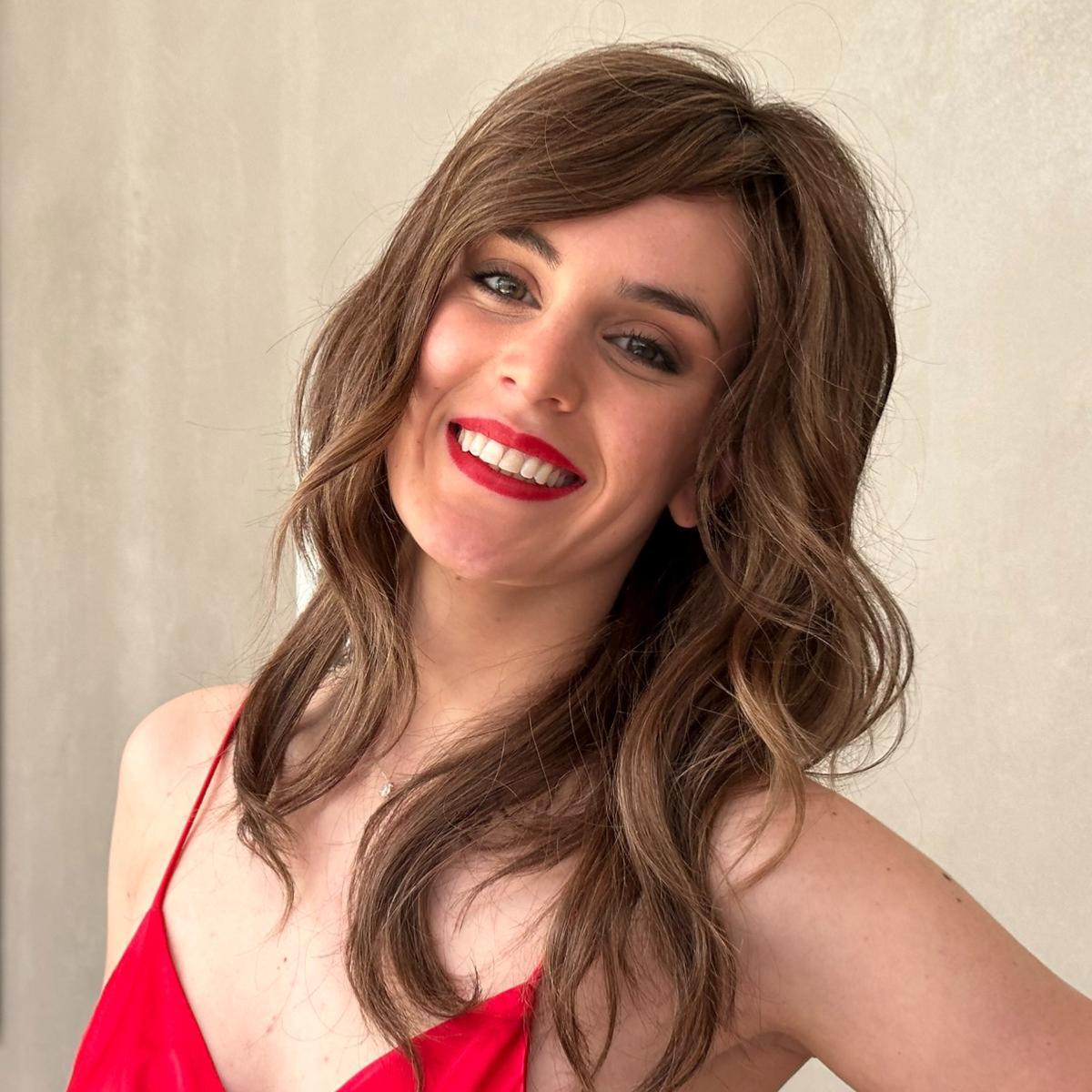 Il s’agit d’une perruque en fibre synthétique. Les cheveux sont longs. La coupe est dégradée avec un coiffage wavy très tendance sur cette longueur.
