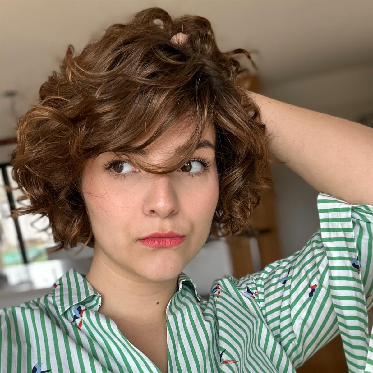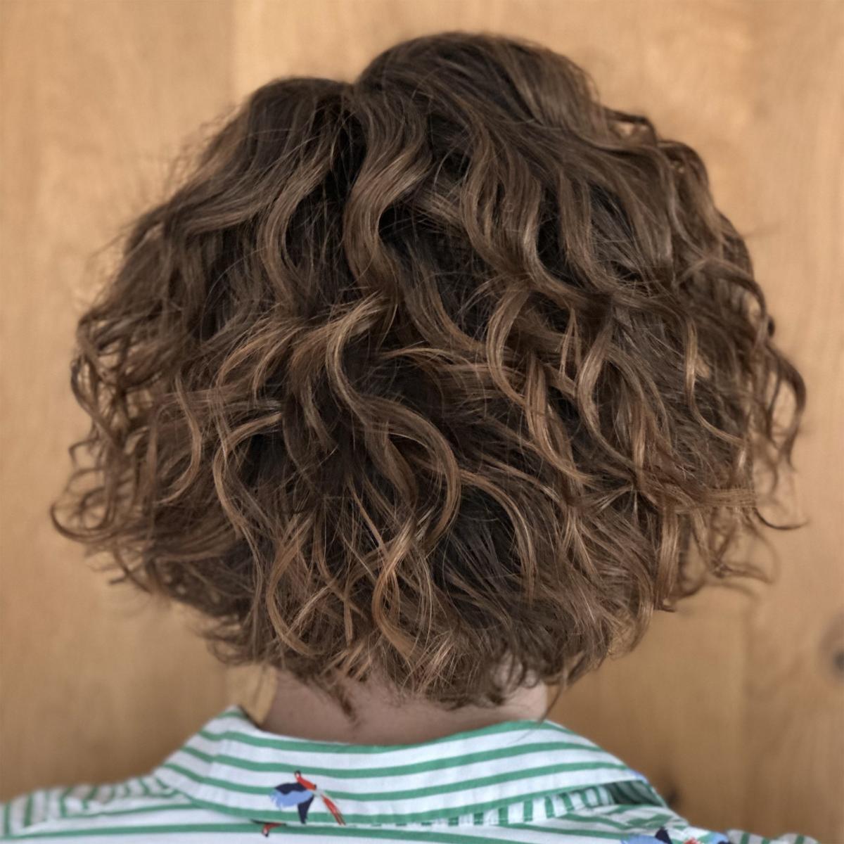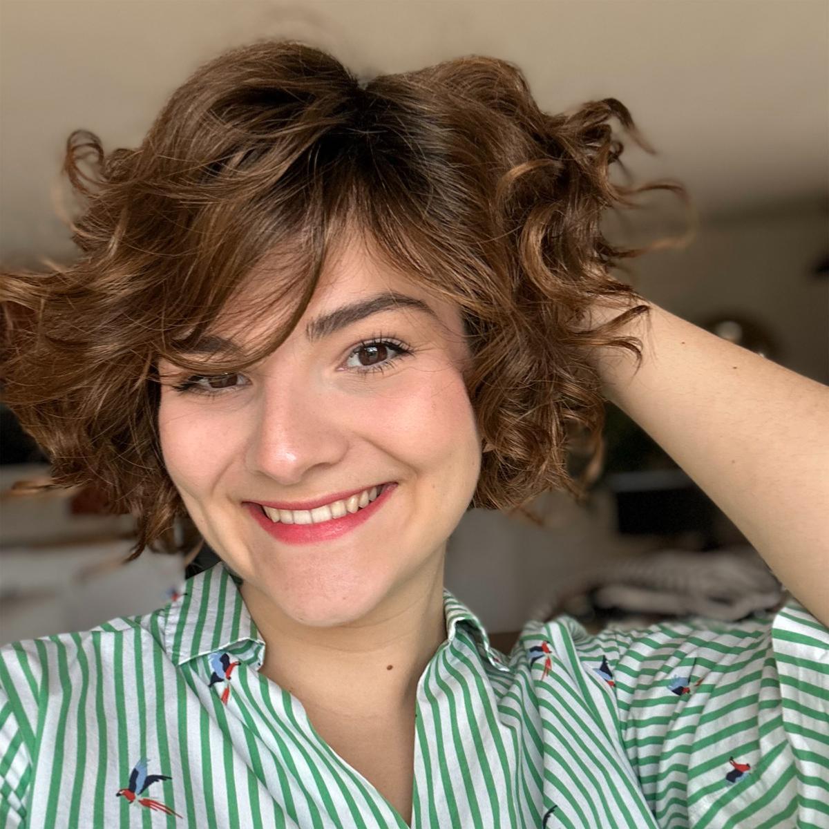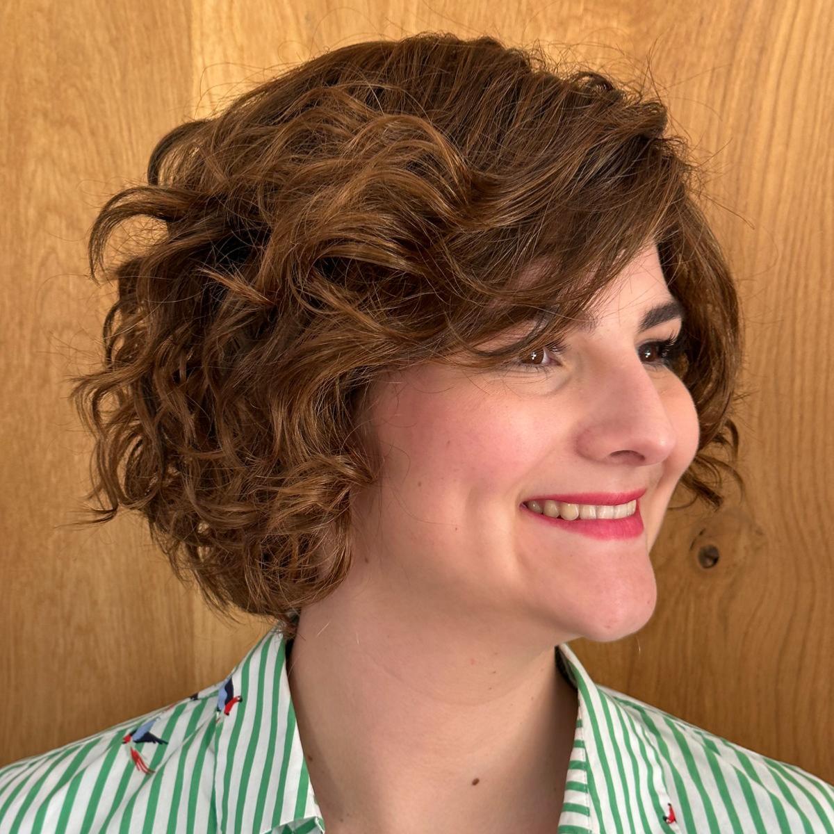 Les cheveux sont mi-longs. Ses boucles lui confère un look romantique.