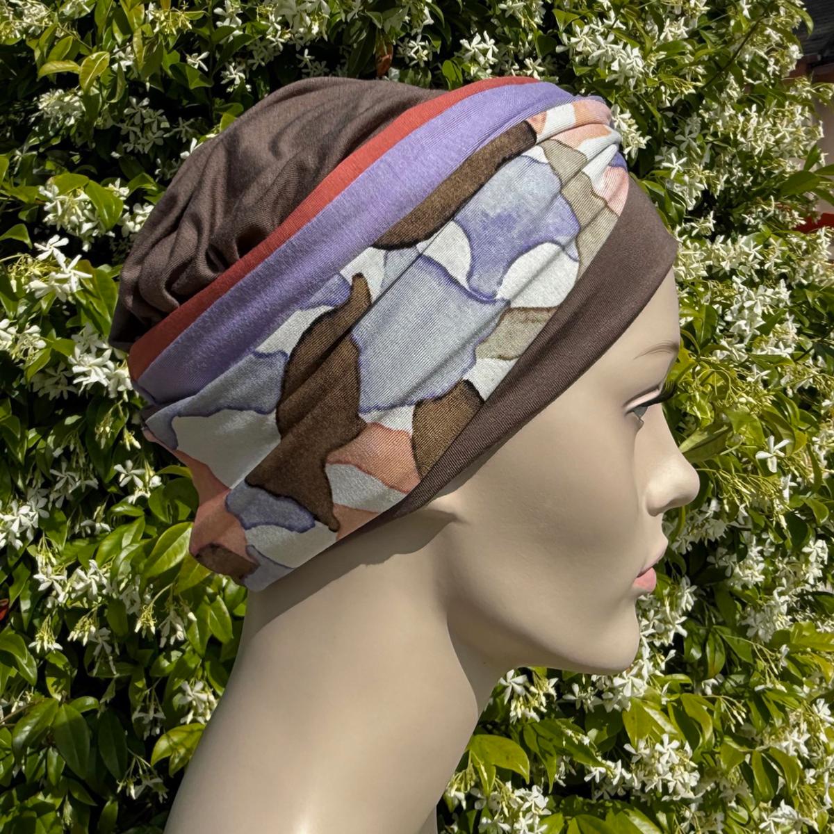 Bonnet uni et bandeau multicolore en viscose de bambou.